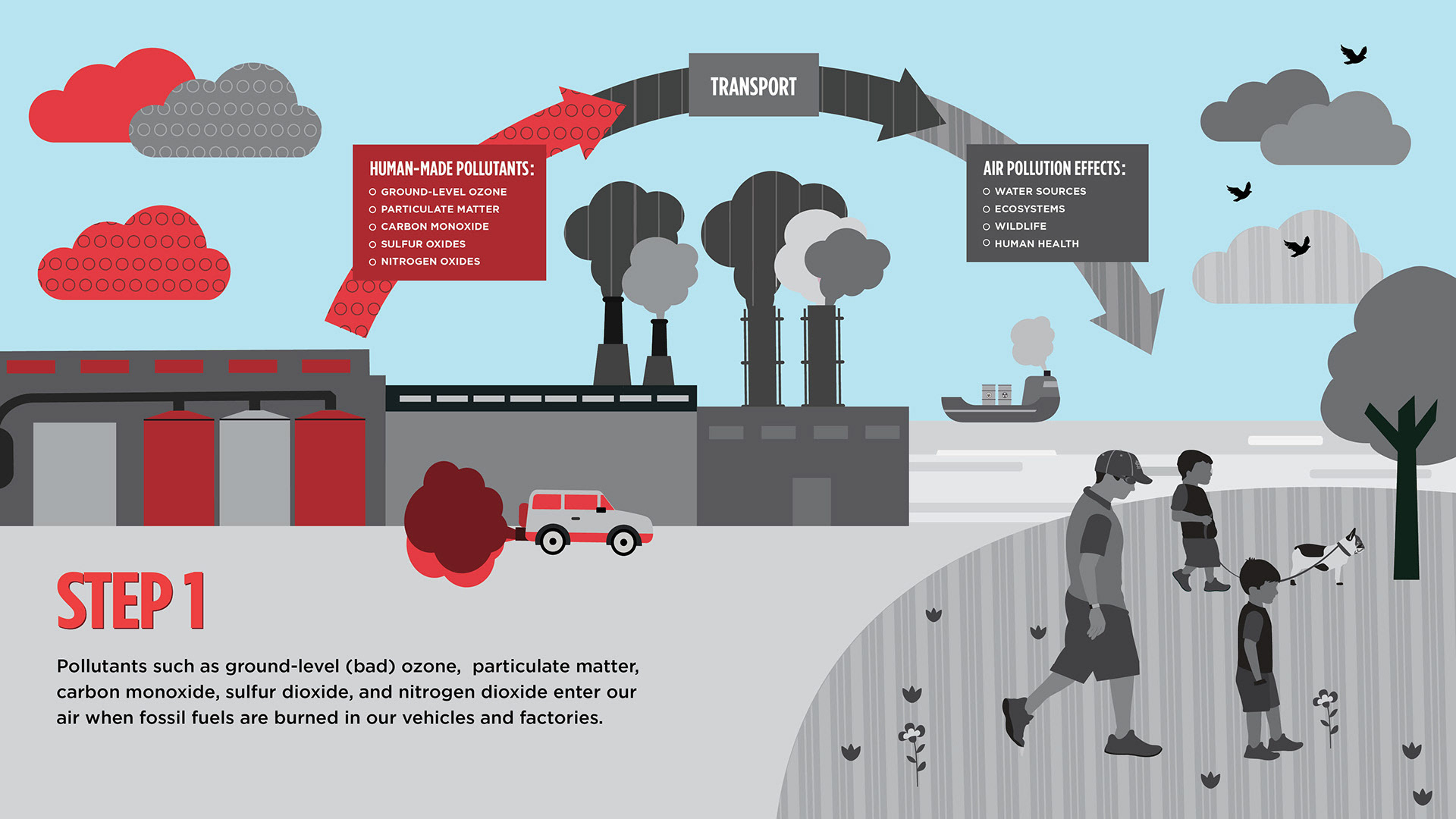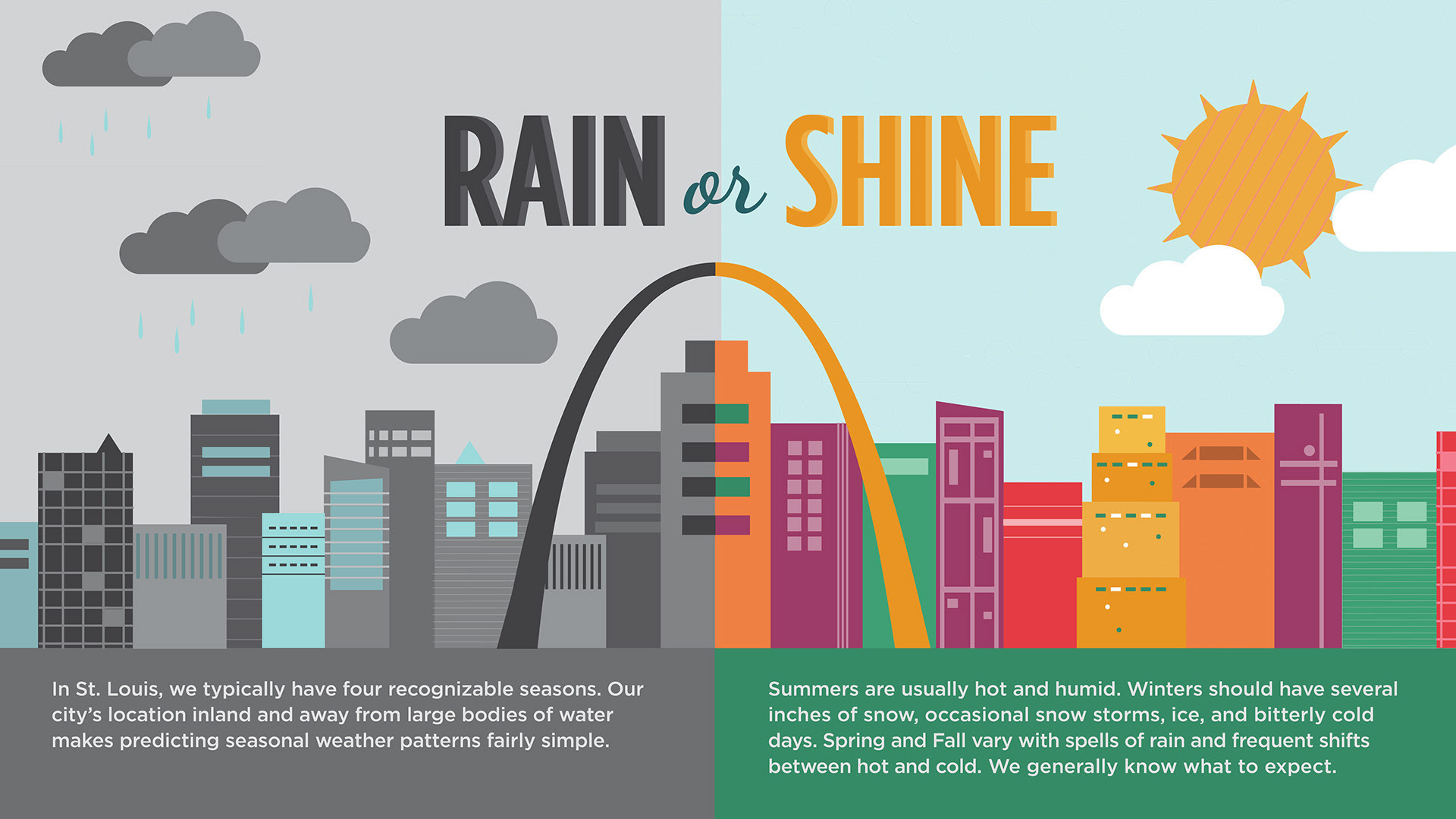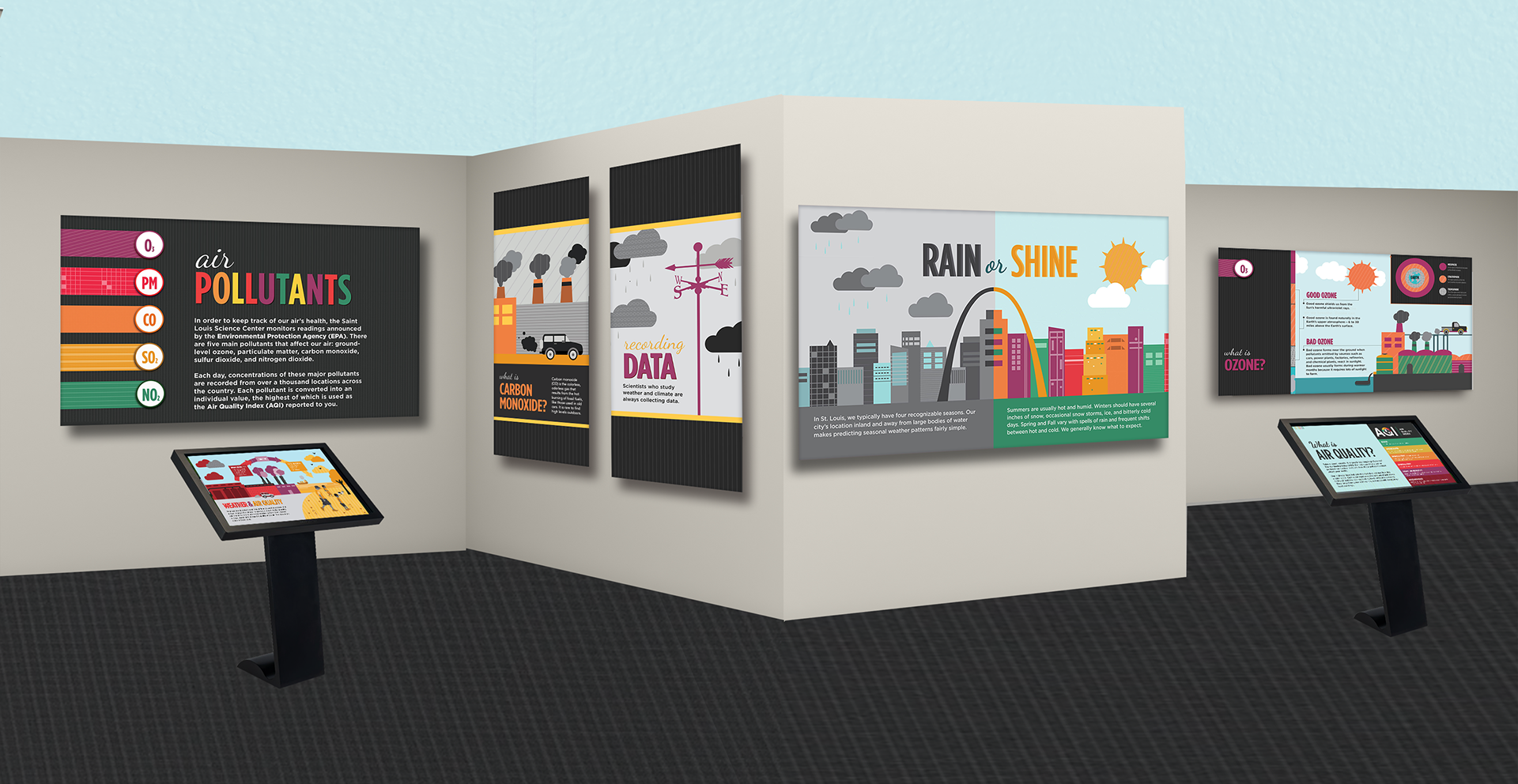 The slides above are illustrated infographics I created for an Air Quality Exhibit at the Saint Louis Science Center. I used bright colors, detailed illustrations, and St. Louis imagery to engage the viewer and help break down complex information.