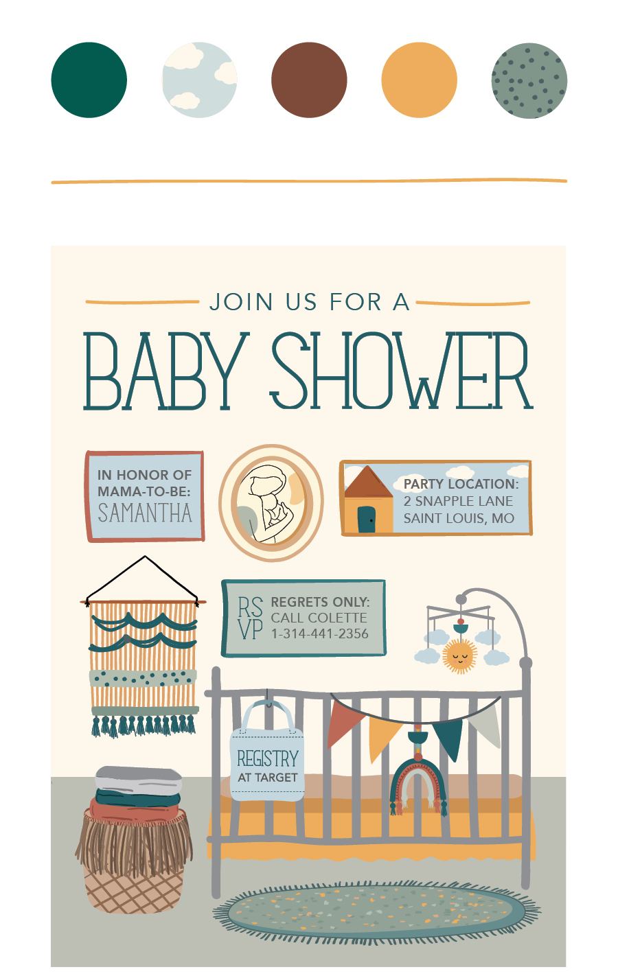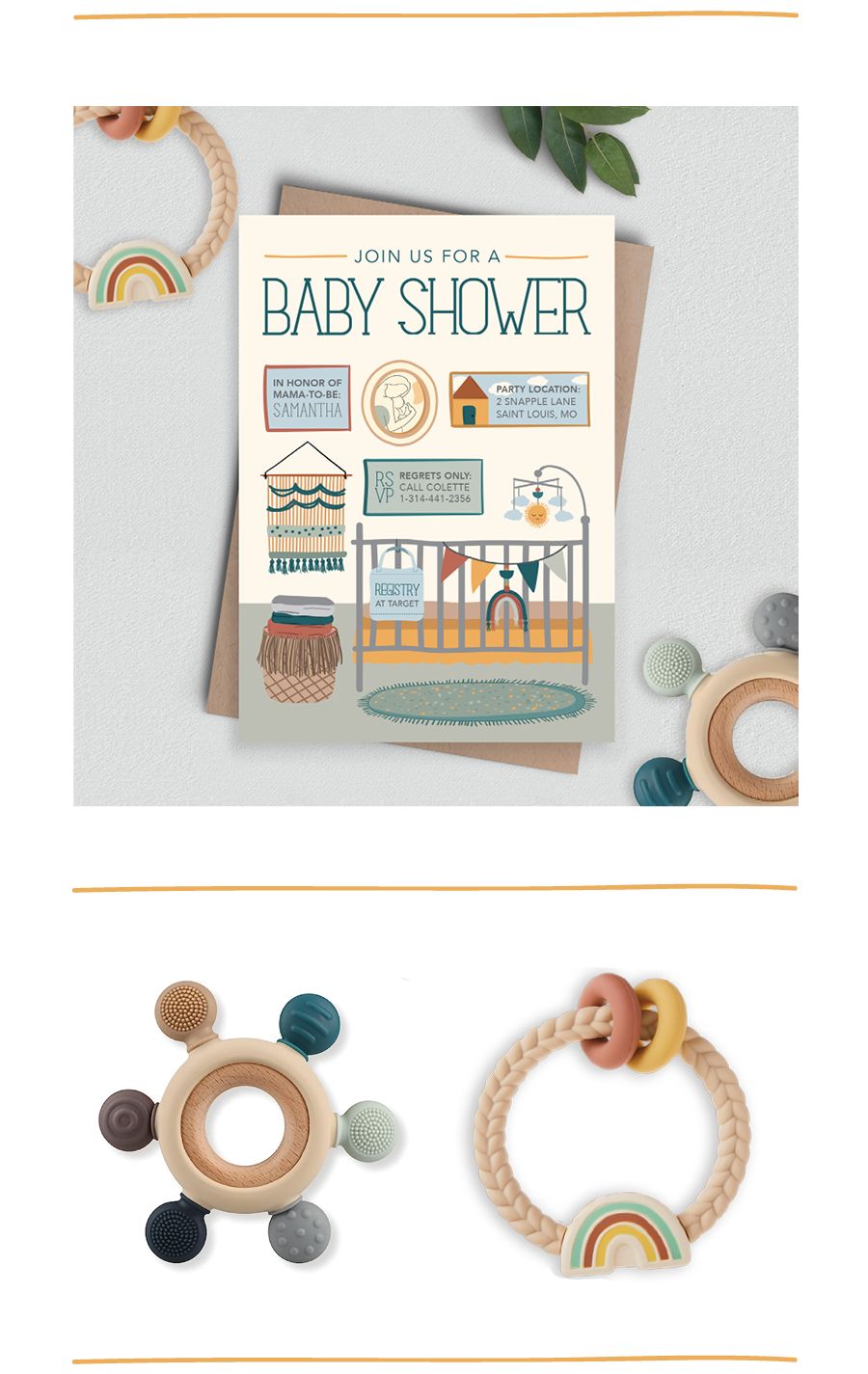 Above is an illustrated shower invitation I did for Minted.com. The company requested a boho baby shower invitation with artwork that can be personalized. Below the invitation are baby teethers I made for a ItzyRitzy.com