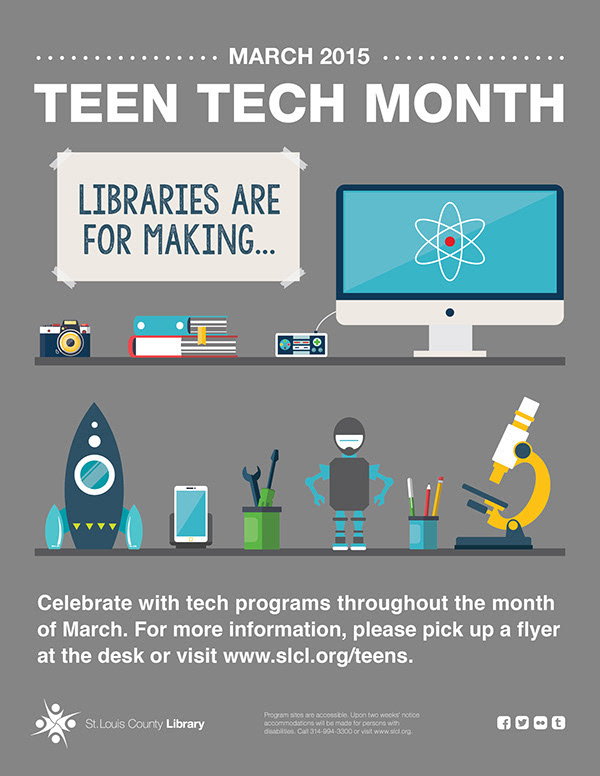Below is branding, illustrations, and animations I created for "Teen Tech Month" at St. Louis County Library.